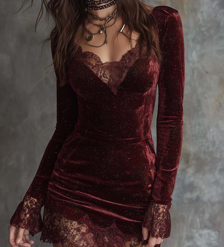 Žaneta | Červené třpytivé sametové minišaty s krajkovým lemováním