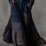Šaty Tereza kombinují sílu vintage stylu s nadčasovou bohémskou elegancí. Jsou ušity z ekologické semišové kůže v tmavě modré barvě a doplněny kostkovanými panely v zemitých tónech. Tento model spojuje různé textury a pohyb v designu, který vyniká svým ručním zpracováním.