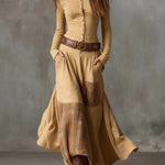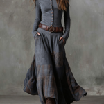 Přiléhavý střih s kovovými knoflíky zdůrazňuje siluetu, zatímco splývavá sukně s patchworkem dodává každému kroku dynamiku a šarm. Šaty určené pro ženy s volnou duší a vkusem pro výjimečnost.