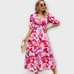 Tyto stylové maxi šaty kombinují moderní abstraktní potisk s lichotivým střihem. Jemný výstřih do V a objemné puff rukávy dodávají elegantní a trendy nádech, zatímco elastický pas vytváří štíhlou siluetu. Vzdušná tkanina zajišťuje bezproblémový chic vzhled, ideální pro různé příležitosti.